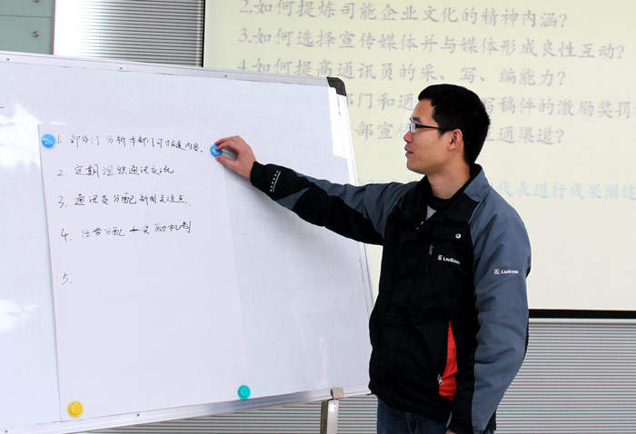 ? ? ? ? 柳工集團(tuán)《柳工機(jī)械》報(bào)主編、高級(jí)宣傳主管譚金紅同志應(yīng)邀到會(huì)指導(dǎo)授課。譚金紅針對(duì)如何發(fā)現(xiàn)新聞和寫好新聞做了詳細(xì)的指導(dǎo),還以柳工集團(tuán)一些大事件稿件舉例說明,同時(shí)提出了“列報(bào)道重點(diǎn)亮點(diǎn)、尋找和發(fā)現(xiàn)新聞點(diǎn)、與領(lǐng)導(dǎo)、編輯多溝通”等寶貴建議。課后參會(huì)人員分成3組就如何搞好公司宣傳工作和企業(yè)文化工作進(jìn)行熱烈討論并進(jìn)行成果闡述,第1組以最切實(shí)可行的建議條數(shù)最多獲得金點(diǎn)子建議獎(jiǎng)。