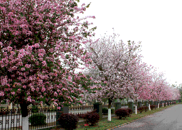 紫荊花的走道,一棵一棵的紫荊花樹,一朵一朵的紫荊花朵,立在走道的兩旁,特別有情趣、浪漫。紫荊花,怒放著,絢麗多彩。